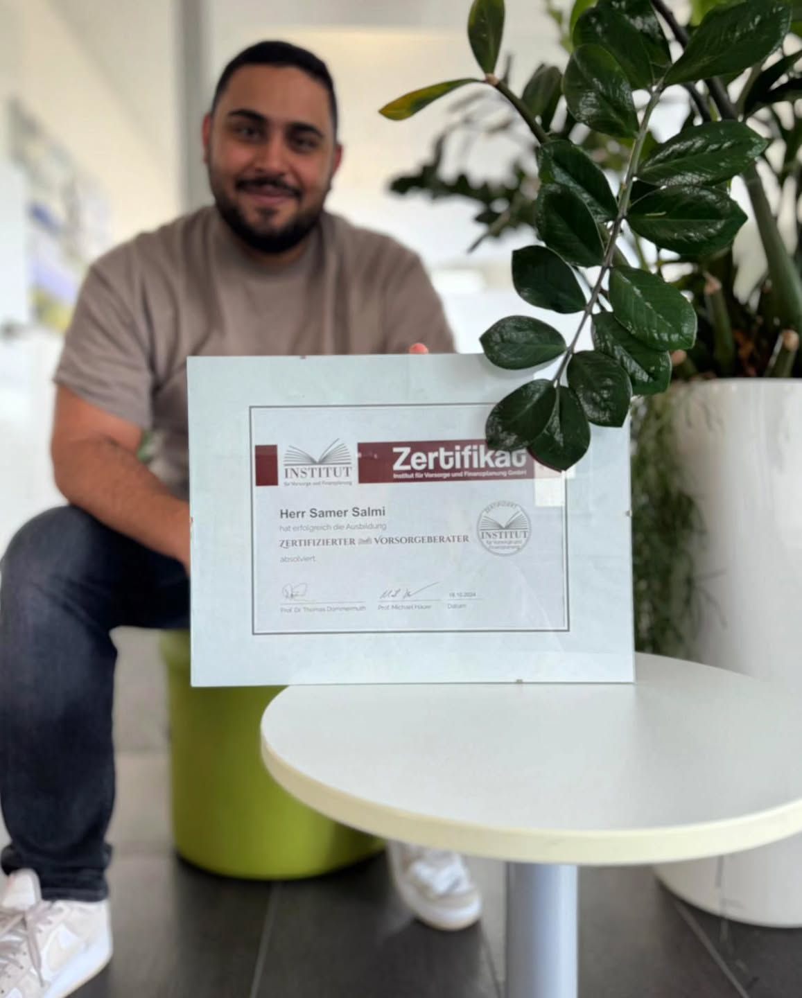 Samer hat erfolgreich seinen zertifizierten Vorsorgeberater bestanden und hält endlich sein Zertifikat in den Händen🎉